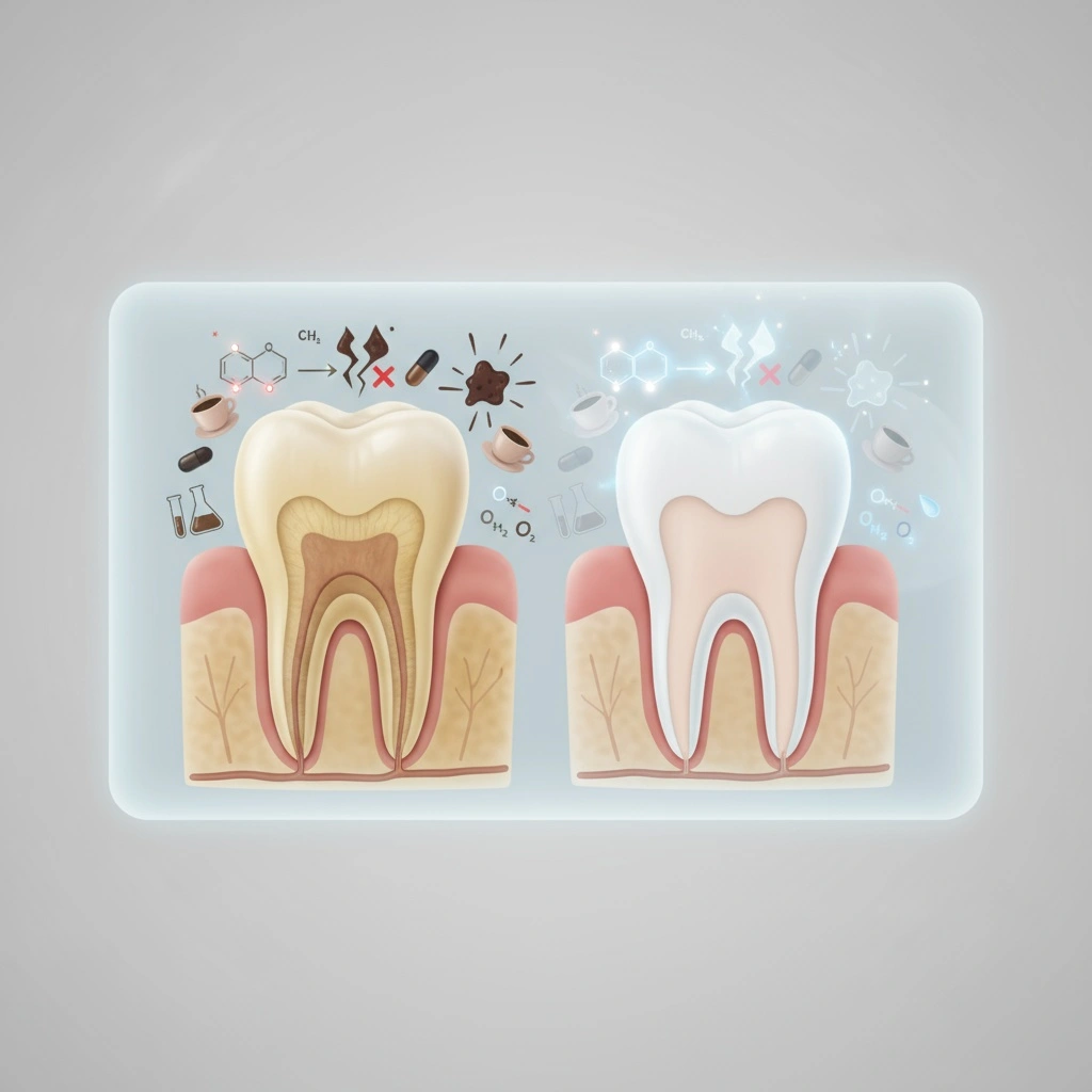 ホワイトニングの基本原理は、過酸化水素や過酸化尿素が色素分子を酸化させて分解することにあります。
