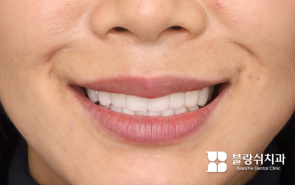 사진은 ‘블랑쉬’ 시술 사례입니다. 기존 치아와의 조화가 좋고 어색하지 않습니다. 이처럼 좋은 재료, 자연스러운 광택과 색상, 밀도 있는 접착력으로 잘 시술한 라미네이트는 나이가 들면서 생기는 부작용 걱정을 크게 줄여줍니다.
